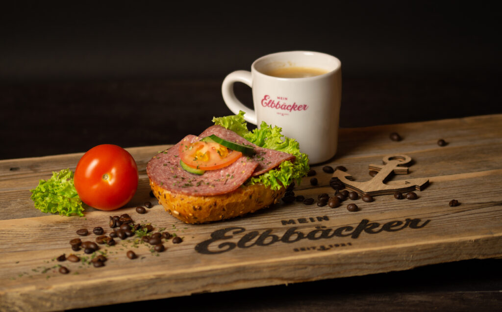 • Ein halbes, belegtes Brötchen mit Mettwurst